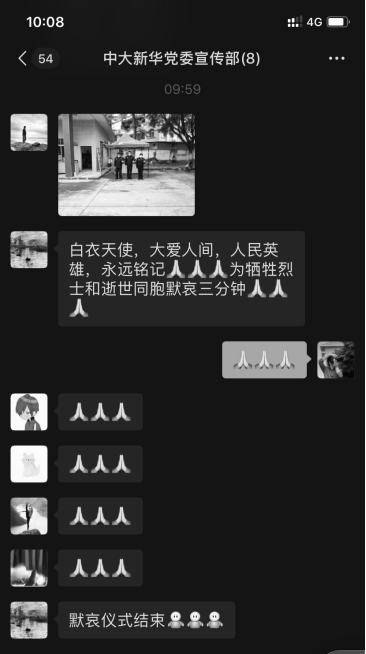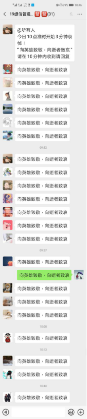 4月4日10时整,各教学单位、各职能部门分单位、分年级、分班级组织全校师生“云追思”,参加线上线下默哀仪式,共同默哀3分钟,以实际行动向抗击新冠肺炎疫情斗争牺牲烈士和逝世同胞表达深切的哀悼。
