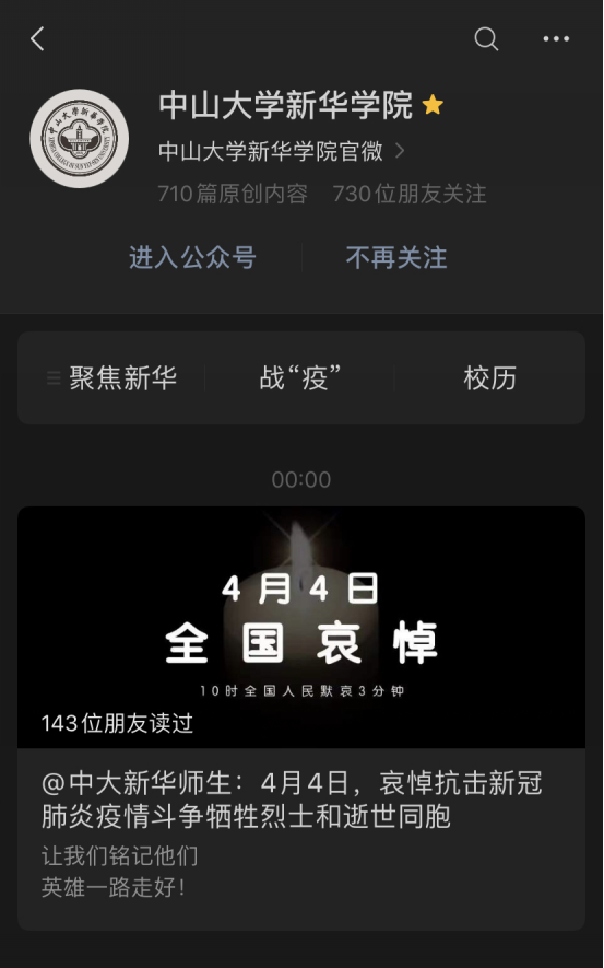 4月4日0时起,中山大学新华学院官方网站首页、官方微信头像等平台随即调整为黑白色调,并发布“@中大新华师生:4月4日,为抗击新冠肺炎疫情斗争牺牲烈士和逝世同胞哀悼”的悼念文章。