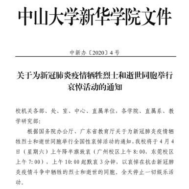 为表达全国各族人民对抗击新冠肺炎疫情斗争牺牲烈士和逝世同胞的深切哀悼,国务院决定于2020年4月4日举行全国性哀悼活动。中山大学新华学院高度重视,快速响应,第一时间发布《中山大学新华学院关于为新冠肺炎疫情牺牲烈士和逝世同胞举行哀悼活动的通知》,统筹部署全校师生举行哀悼仪式。
