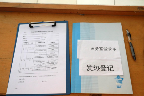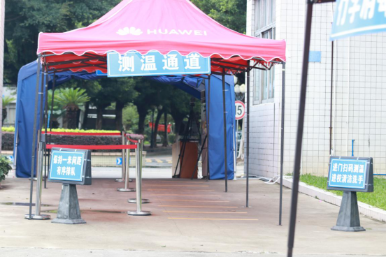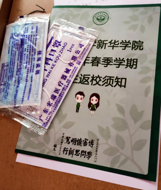 学生通过校门的测温通道,扫ixh小程序健康码,查看“粤康码”或“穗康码”,测体温、检查“核酸检测证明”,发放《中山大学新华学院2020年春季学期学生返校须知》及口罩等防疫爱心包