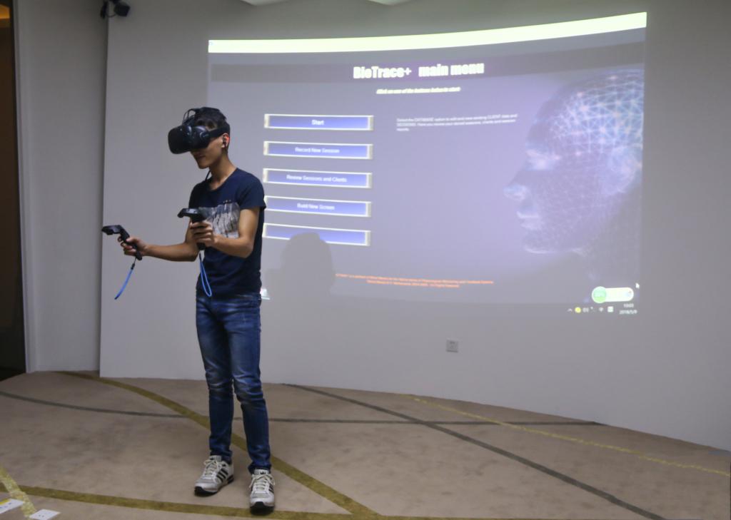 学生在生物反馈实验室体验沉浸式虚拟现实(VR)技术 图/学校提供