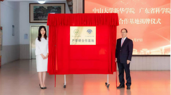 颜国荣副书记与刘霖霖董事、校长助理共同为“中山大学新华学院、广东省科学院产学研合作基地”揭牌。