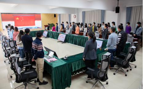 与会师生代表与直播现场一同行注目礼、唱国歌