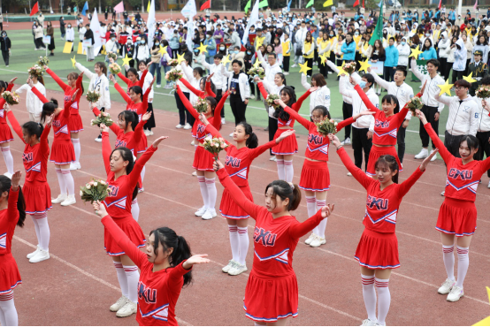 鲜艳热烈的服装,炫彩的花球,你们笑起来真好看,汉语言文学,昂首阔步,向阳而生,不负好时光。