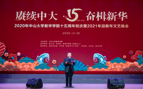 为回顾中大新华办学十五年发展历程,激励广大师生爱校荣校精神,营造良好的校园文化氛围,凝聚各方面力量,持续推进学校五育并举,全面、快速、可持续发展。在新年来临之际,学校于2020年12月30日晚在东莞校区体育馆举办了主题为“赓续中大·奋楫新华”的十五周年校庆晚会暨2021年迎新年文艺晚会。本次晚会由中山大学新华学院主办,校工会、音乐系、党委宣传部(新闻中心)承办,校长办公室、学生处(党委学生工作部)、校团委、总务处、保卫处等单位协办。学校党政班子、教学督导室督导、各院(系)党政负责人、各党政职能部门负责人出席此次盛会,与全校师生一同踏上2021年新征程、新起点。