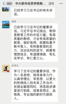中文系专职教师李想:在过去的2020年,我们共同面对疫情的考验,医护人员奋勇抗击新冠疫情,作为老师的我们,开启了新的教学模式——线上教学。如今听习总书记谈起的时候,不禁又一次回想起了2020年不寻常的时光。的确,“教育是国之大计、党之大计。”作为新时代的女性,作为一名人民教师,我将坚守我的岗位,为党育人,把立德树人融入到每一节课中,让学生感受我们祖国的美好,感受文化自信,身体力行地融入到中国梦的筑梦、铸魂之中。