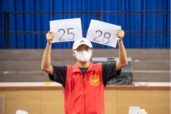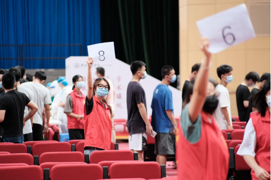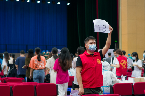 为维护检测现场秩序,学生志愿者们高举“爱的号码牌”,指引受检者有序进场,进行排队检测。
