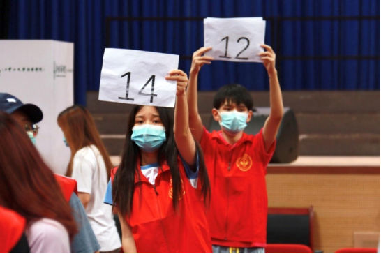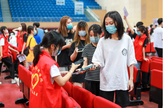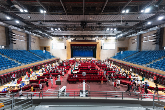校团委组织的180名学生志愿在东莞校区体育馆集结完毕,并迅速有序进行分工、培训。