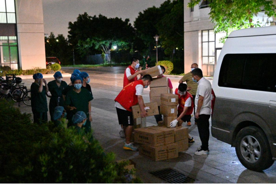 6月19日0时,学校总务处连夜准备相应物资,并做好东莞校区全员核酸检测现场的布置。凌晨4时,学生志愿者将核酸检测相关物资搬运至馆内。