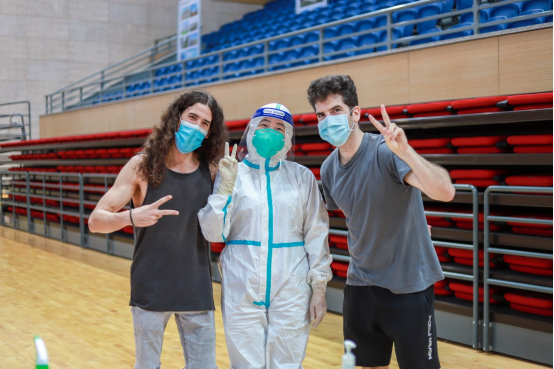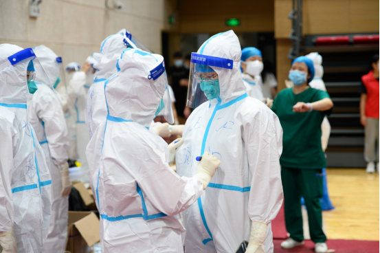 正在正式开展核酸检测工作前,医护人员相互勉励。