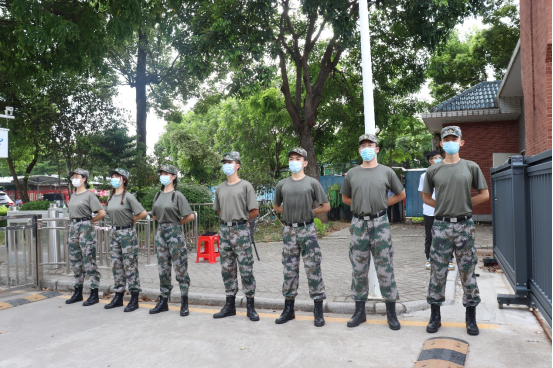 国旗护卫队在校门处协助值守,加强门防检查工作,维护校园秩序。