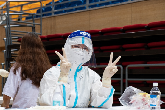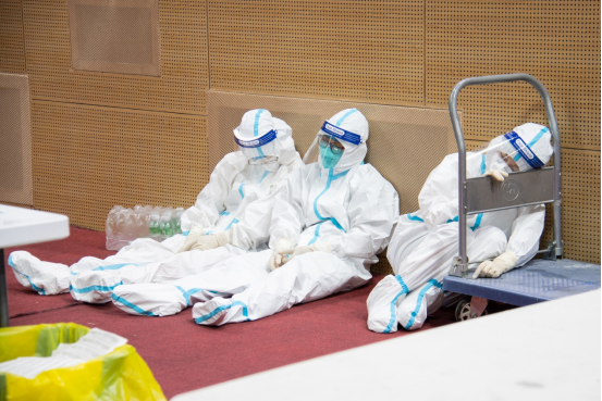 从黑夜至清晨,太阳逐渐升至高空,广州新华学院东莞校区的核酸检测工作也逐渐接近尾声。医护人员和工作人员们难掩疲惫,就地稍作休息。
