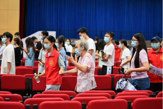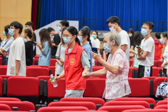 学生志愿者牵扶年迈的教职工家属前往检测点,鲜红的马甲是深夜体育馆内一抹温暖的风景。