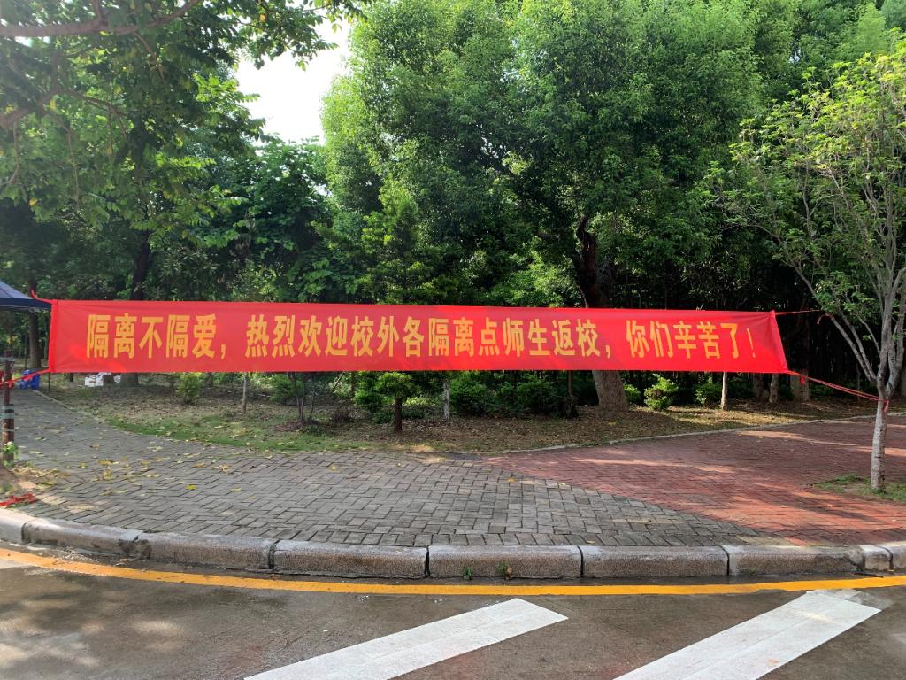 今天的广州新华学院校园里到处洋溢着欢声笑语,学校总务处协同物业部门在师生返校前一晚就对校道进行了全面清洁,为返校师生回家营造良好的校园环境。此外,校园里还悬挂了“欢迎隔离点师生回家,我们牵挂你们!”“隔离不隔爱,热烈欢迎校外各隔离点师生返校,你们辛苦了!”“广州新华师生平安返家,暑假快乐,新学期见!”等暖心标语,句句话语温暖人心,营造了浓厚温馨的校园氛围。