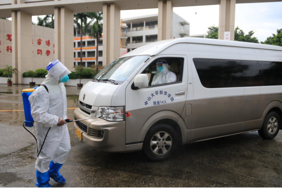 工作人员对校园重点区域及出入车辆进行清洁消杀