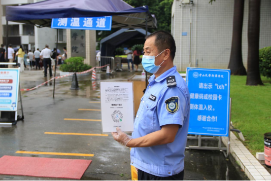 门岗保卫严格落实按照入校测温流程:“佩戴口罩、扫码、亮码、测温”