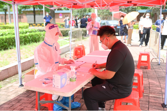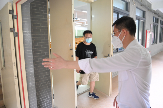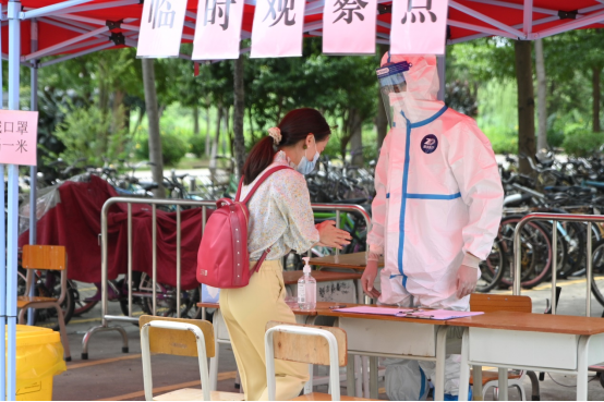 体温异常的“学生”在临时观察点进行消毒、更换口罩、再次测量体温、进行健康监测登记等