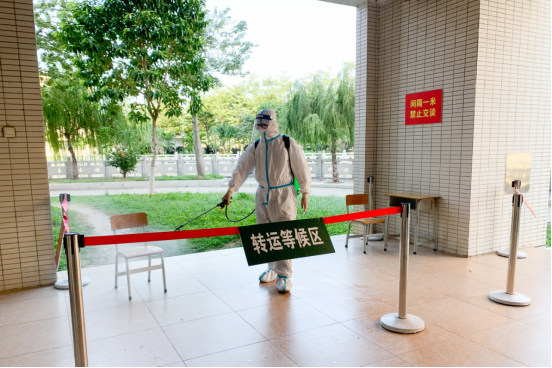 工作人员对隔离宿舍、临时观察点和转运等候区进行消毒
