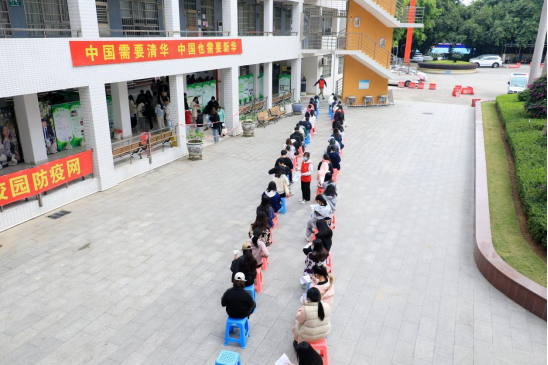 排队等候过程中,在场师生在志愿者、工作人员的指引下依次测量体温、扫码入场,准确填写“广东省新型冠状病毒疫苗接种知情同意书”,再到录入个人信息、接种疫苗、留观等待,直至顺利离场,接种工作整体推进过程平稳、高效、有序。