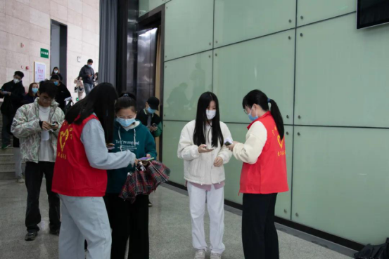 经过昨日的核酸检测活动后,21级法学专业的王亦琛(右一)对身穿防护服、辛勤工作的志愿者们心生向往,毫不犹豫地报名了此次志愿服务活动。其中,她主要负责的工作是在留观区引导接种师生隔位就坐。在工作过程中。她印象最深刻的是一位在留观过程中与她亲切交谈的老师。老师主动询问志愿者是否用过了早餐,并提出了代买早餐的想法,这令她深受感动。