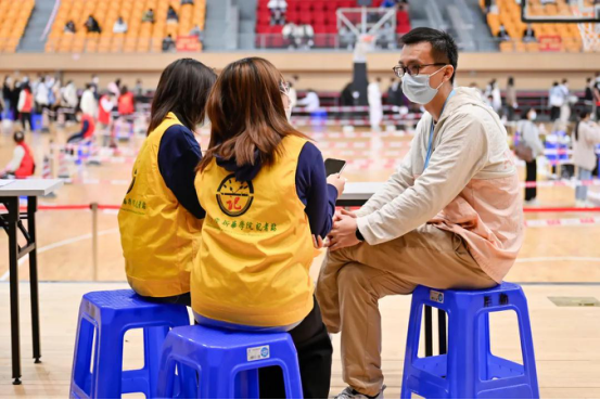 现场医护人员对接种师生的第二针接种日期与健康情况进行详细问询,工作人员、志愿者维护接种队伍秩序。前来接种疫苗的师生有序排队,依次接种,现场工作有条不紊,彰显了广州新华人的责任与担当。
