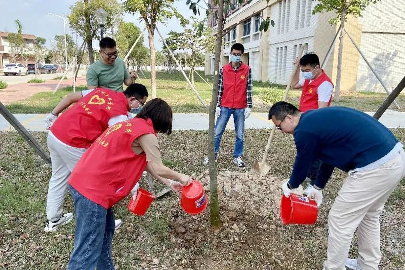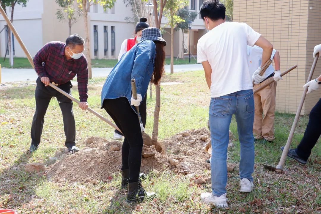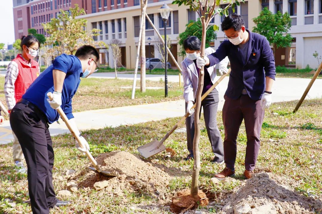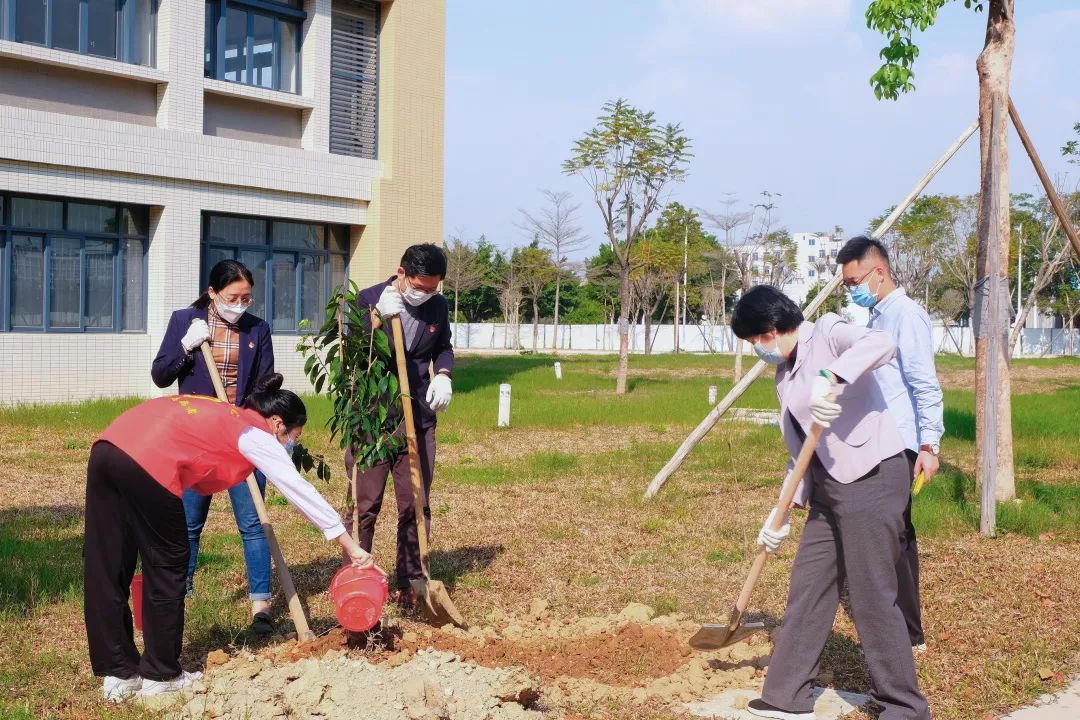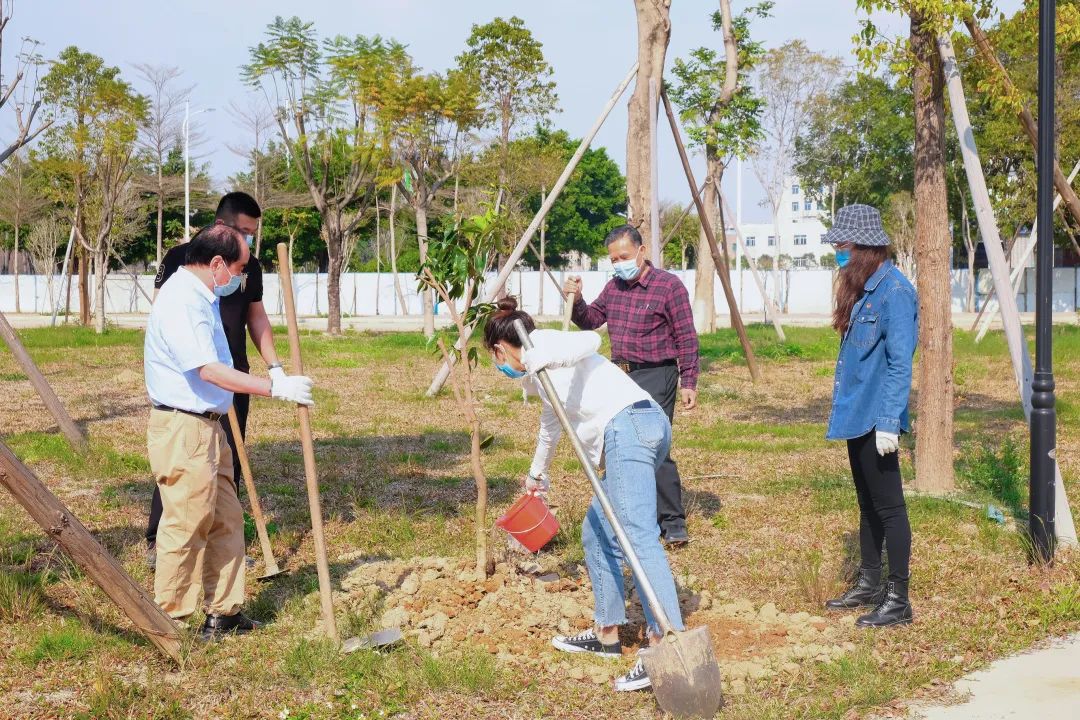 学校党委书记周云,党委副书记、副校长蓝永金,广东东宝集团有限责任公司副董事长刘荣宏,各职能部门教师代表,学生代表参加了植树活动。
