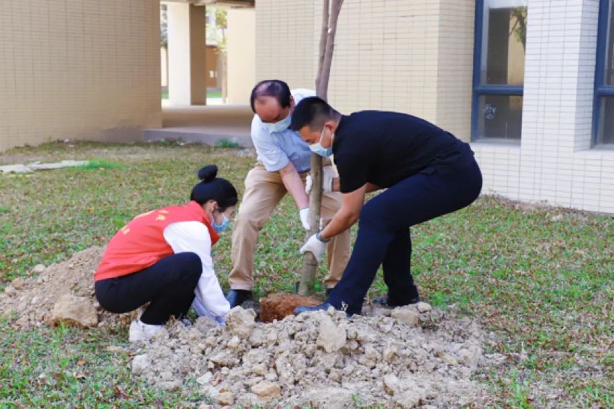 春风吹拂,新华校园处处生机蓬勃。植树现场气氛热烈,到处都是忙碌的身影,师生们齐心协力,三五人一组,分工协作、配合默契,挥锹铲土、扶树正苗、提水浇灌,种下了一颗颗树苗,共同为校园增添新绿。