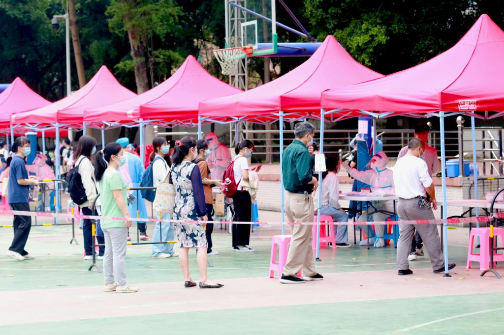 学校师生员工在采样区排队间隔一米,佩戴好口罩,不交谈
