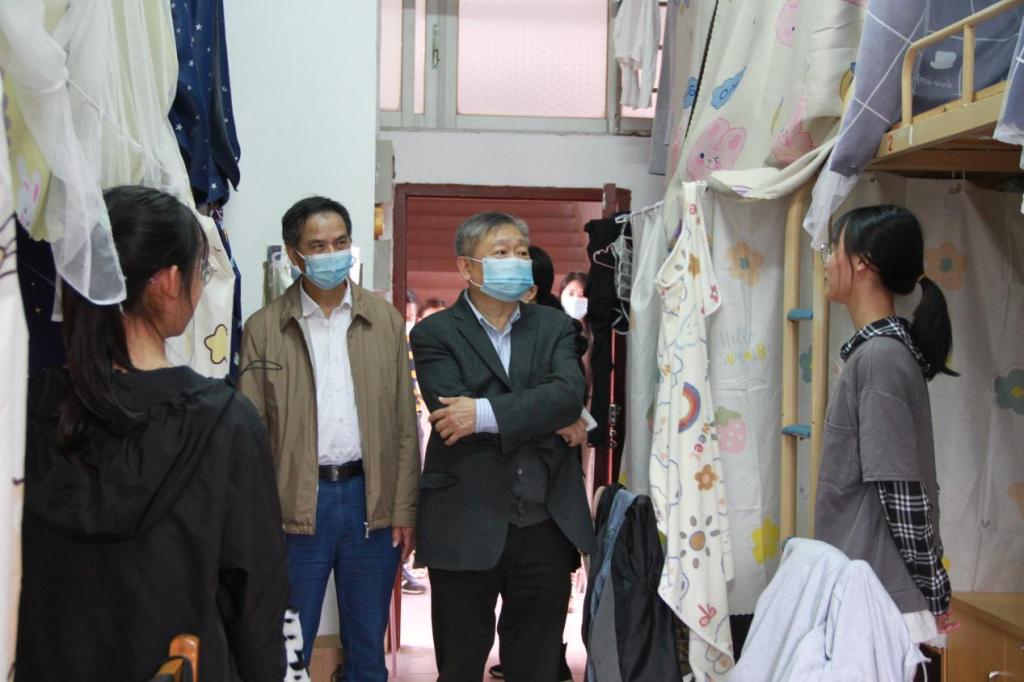 校长王庭槐(右二)、纪委书记杨卫华(左二)走访学生宿舍与学生亲切交谈