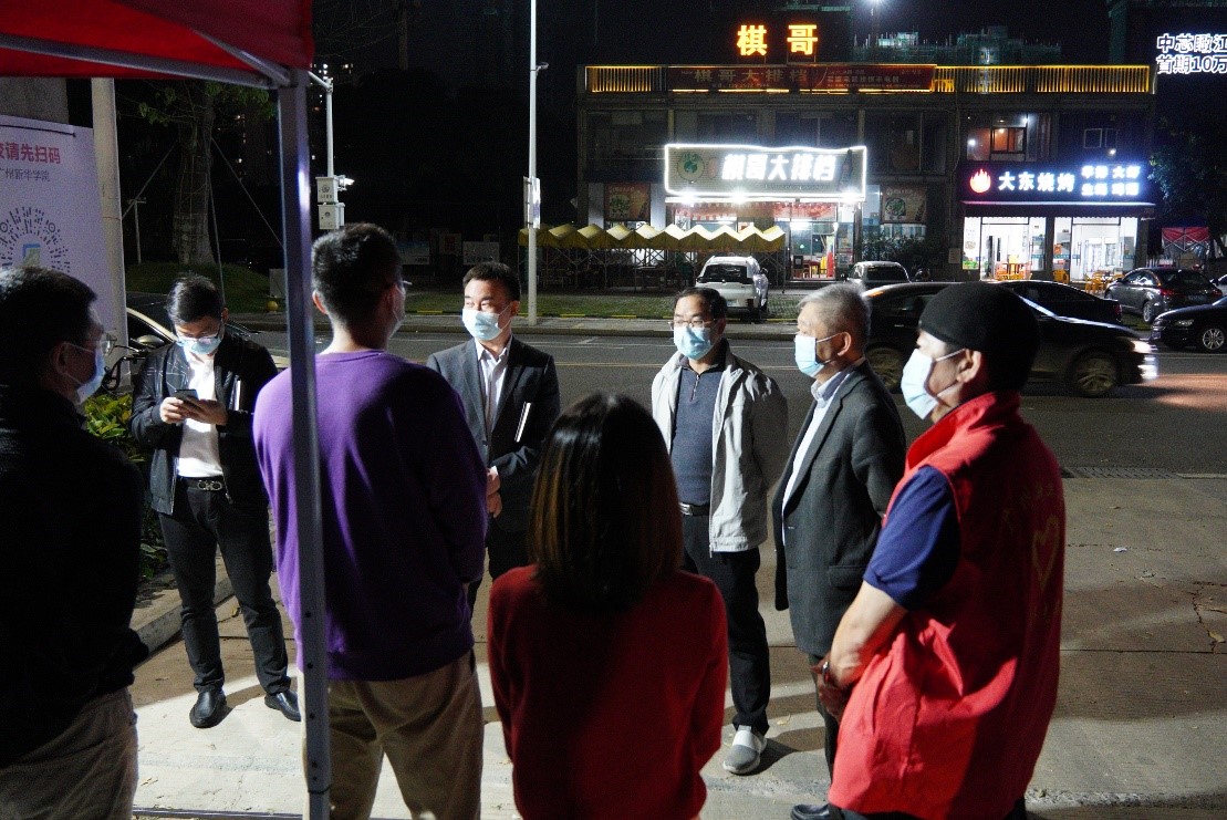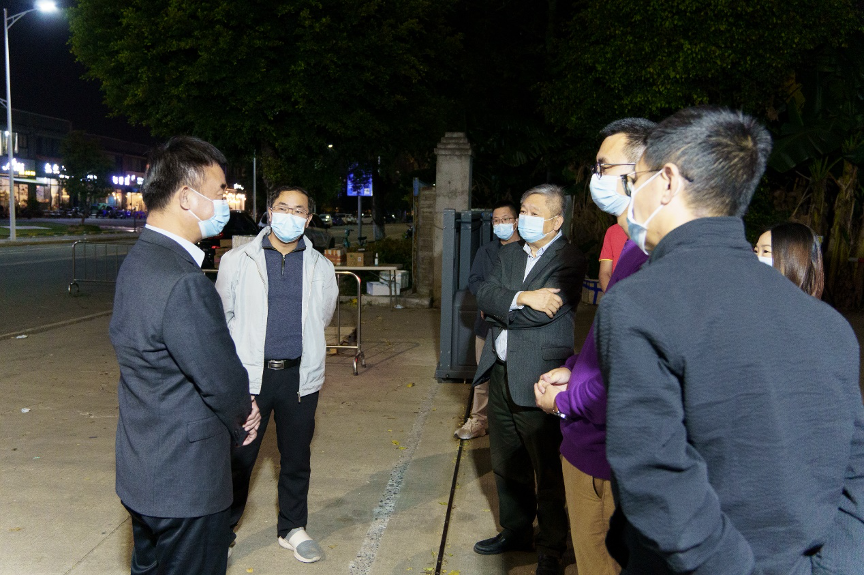 为从严从实从细抓好清明期间校园疫情防控工作, 4月3日22时,东莞市教育局王健副局长一行莅临我校东莞校区进行疫情防控专项督查。我校值班校领导王庭槐校长,东莞校区防控办执行主任、总务处处长谢凯忠,人资处处长林源,艺术设计与传媒学院副院长周国屏,学生处副处长陈丽,校长办公室副主任张强及保卫处值班干部等值班人员现场汇报了近期东莞校区疫情防控有关情况。