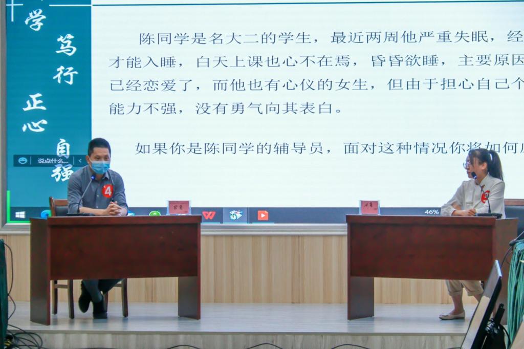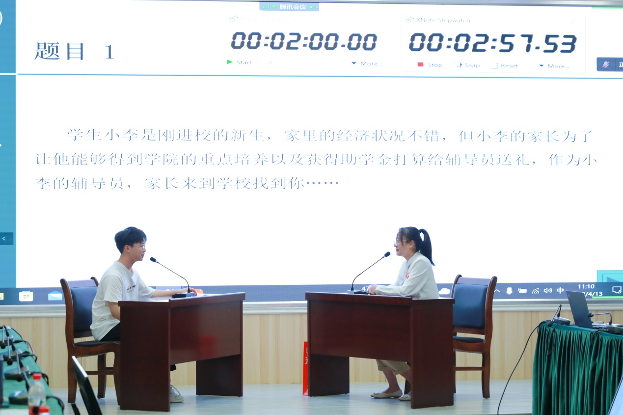 谈心谈话环节主要考察选手们对学生特征、学生成长成才规律的了解把握程度,对学生的教育引导能力、解决问题困惑和实际问题的能力等。比赛现场,选手们思路清晰,沉着应对,科学运用学生特征及成长规律与学生开展互动式谈心谈话,展示了良好的精神风貌和扎实的专业素养。