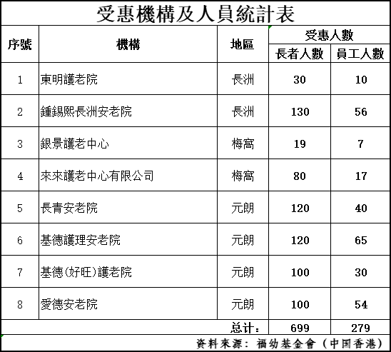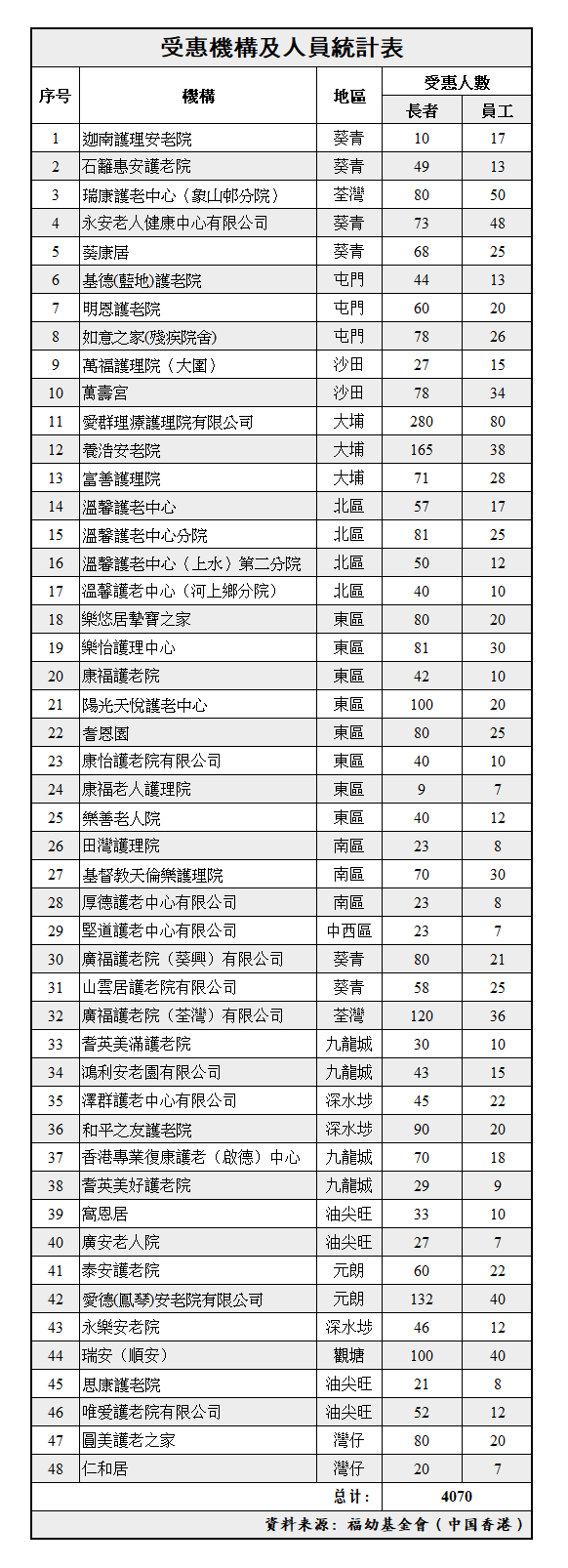 据福幼基金会(中国香港)反馈,此次捐献的援港抗疫物资运达福幼基金会后,由基金会的义工第一时间将物资派发给护老院的老人和员工,分两批次派发:第一批派发48家护老院,惠及4070位香港同胞;第二批派发8家护老院,惠及978位香港同胞。截至4月20日,共惠及56家护老院、5048位香港同胞。