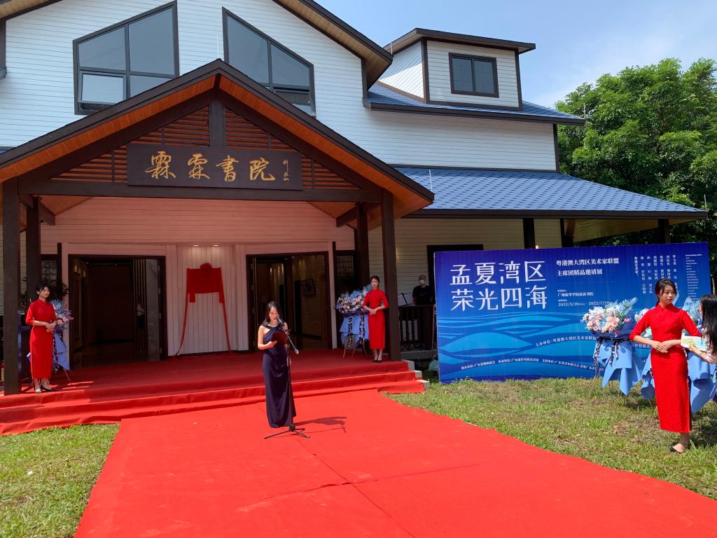5月20日上午,展览圆满开幕。开幕式特邀中国美术家协会顾问、中国艺术研究院研究员、博士生导师、广东省美术家协会名誉主席许钦松,广州市美术家协会主席、粤港澳大湾区美术家联盟主席汪晓曙,广东技术师范大学美术学院院⻓、粤港澳大湾区美术家联盟副主席刘颖悟,广州美术学院教授、广东省政协书画院副院长张弘,广东工业大学艺术学院教授、粤港澳大湾区油画艺委会副主任张洪亮,广东外语外贸大学教授陈建平、王桂珍,共青团广东省委统战联络部副部长、广东省青年联合会副秘书长陈飞,香港大学珠三角校友会会长李爱国,香港华菁会副主席田斌、郭齐飞,香港华菁会深圳分会会长周远志,香港华菁会副秘书长杨田田,广东省潮州商会秘书长许志贤等领导嘉宾莅临开幕式现场指导。开幕式上,“粤港澳大湾区美术家联盟广州新华学院美育基地”完成挂牌,落户广州新华学院霖霖书院。许钦松、汪晓曙、周云、刘婉莉(字霖霖)等领导嘉宾共同为基地揭牌。接下来,学校将依托该美育基地的丰富资源,为广大新华师生带来形式内容多样、品位高雅的美育活动。