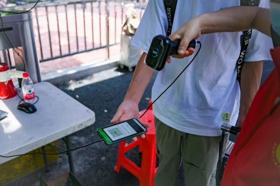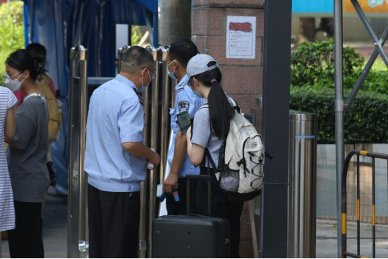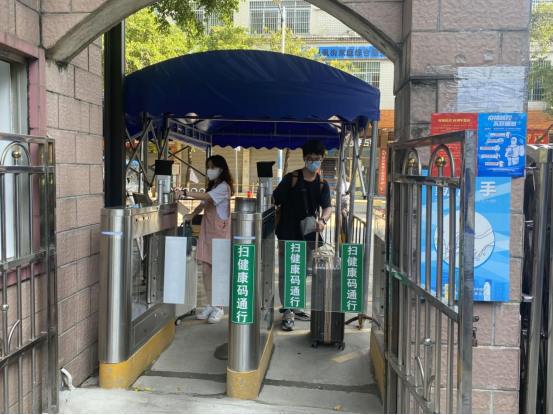 校门处,同学们按要求依次出示粤康码、行程卡与48小时核酸阴性证明,并通过扫描ixh健康码、测温等流程有序进入校园。