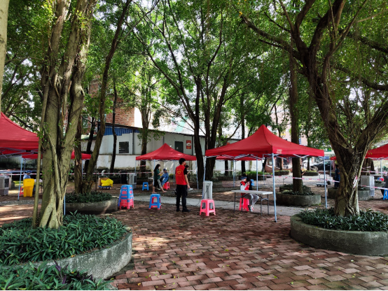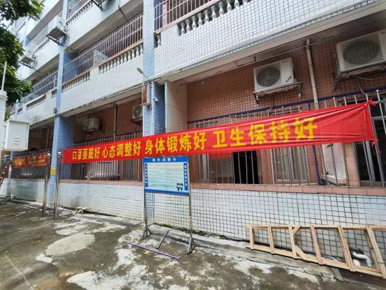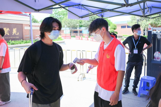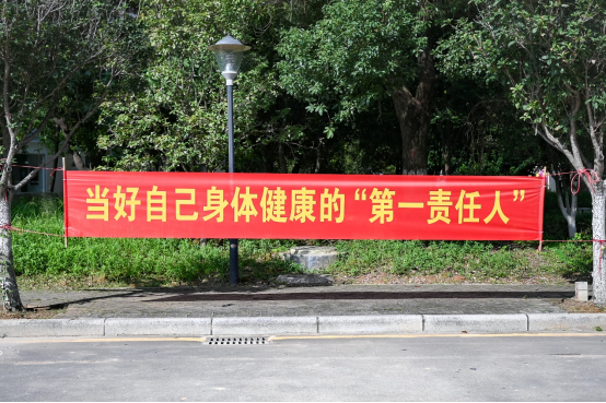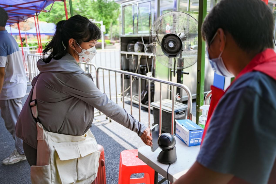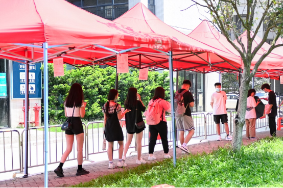 校门内,三十余个帐篷拼接搭建而成的“健康长廊”,是为同学们遮阳庇荫的暖心“第一站”。同学们扫描iXH健康码、检查粤康码和行程卡、测温、核酸检测等流程,均有学校的贴心“守护”。