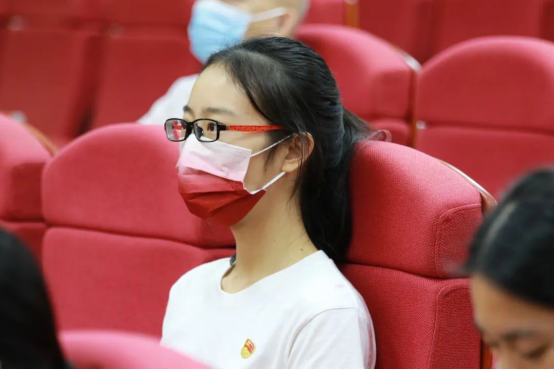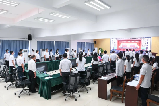 广州新华学院参加线下集中观看的党政领导干部、师生党员代表齐唱国歌