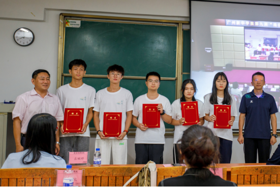 王庭槐校长(左一)为2022级逸仙新华班广州校区学生代表颁发入班证书