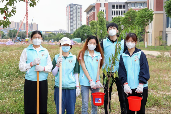 管理学院师生志愿者、轩志学社轩逸志愿服务队与树苗合照