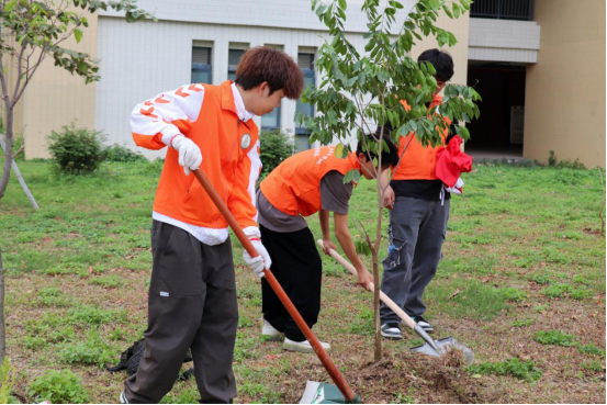 植树现场,师生志愿者们分工协作、齐心协力一起挥锹铲土、填坑扶苗、培土踩实、提水浇灌,种下了一棵棵树苗,为新华校园再添一抹抹绿。