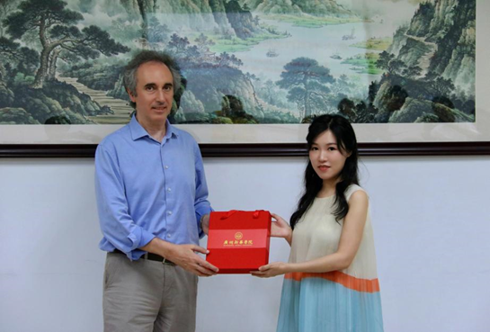 学校董事会董事、副校长刘婉莉(霖霖)向克劳迪奥·加布里埃尔教授敬赠纪念品