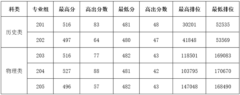其中,2023年历史类投档分480-481分,高出本科线47-48分,最低排位52535-53569,在去年基础上提高7分,最低排位前进6900多名。2023年物理类投档分481-482分,高出本科线42-43分,最低排位168490-170670,在去年的基础上提高6分,最低排位前进2500多名。