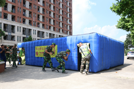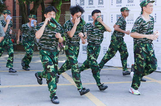消防疏散演练开始前,各方阵的教官向同学们说明逃生步骤及注意事项。疏散演练过程中,同学们听从教官的指挥,用帽子和湿毛巾捂住口鼻,放低重心,迅速且有序地从宿舍撤离到安全空旷的平地。随后,消防员们手持消防水枪,快速消灭火源。