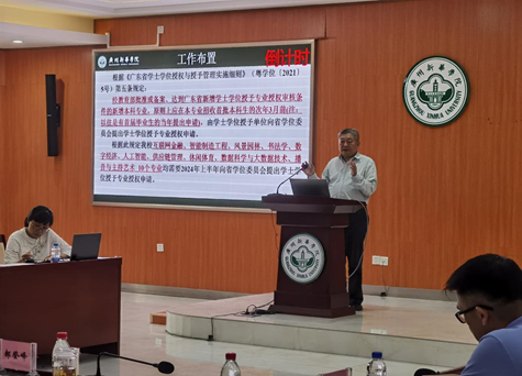王庭槐对《广东省学士学位授权与授予管理实施细则》(粤学位〔2021〕5号)中关于学士学位授予专业授权申请的新规定及评审指标体系进行了详细解读,并对具体分工做出要求。他强调,各受评专业及职能部门要充分认识专业审核的重要性和必要性,增强责任感和使命感,遵循“以评促建、以评促改、以评促管、评建结合、重在建设”的原则,扎实做好专业建设和资料准备工作,把新增学士学位授予专业审核作为促进学科专业发展的机遇和动力,确保本次10个受评专业学士学位授权申请审核工作按照相应时间节点稳步向前推进。