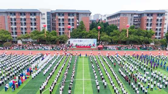 学校校长王庭槐为2023年田径运动会开幕式致辞。他指出,党的二十大报告中提出“广泛开展全民健身活动,加强青少年体育工作,促进群众体育和竞技体育全面发展,加快建设体育强国”,为全民健身和竞技体育的全面推进指明了方向。此次校庆运动会作为我校践行体育强国的重要活动,不仅承载着运动健儿们拼搏的热情、团结的力量和友谊的纽带,更代表着人类顽强拼搏、奋勇争先的体育精神。希望全校师生高度重视体育在“三全育人”“五育并举”中的重要地位,强体魄、铸精神,成为体育强国建设的践行者;希望各位新华健儿在本届运动会中赛出佳绩、赛出团结、赛出风采,成为新时代中国式现代化的建设者和精兵强将。