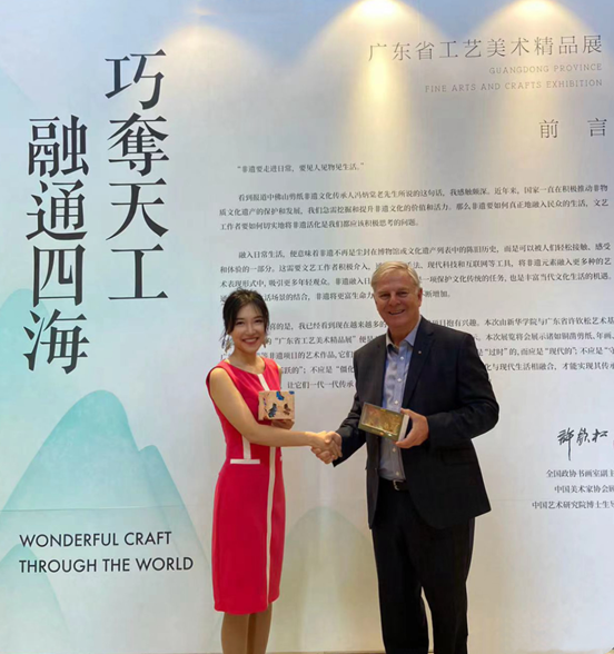 刘婉莉(霖霖)表示,非物质文化遗产是人类文化传承的重要载体,本次展览将陶瓷、广绣、剪纸、年画等非遗艺术品带进校园,旨在以艺术为桥梁,引导师生近距离感受传统非遗文化的魅力,拓宽审美视野,提升美学修养,增强自豪感和文化自信,传承中华文化基因。通过此次交流活动,希望能向Peter James Little AM教授展示中华传统非遗艺术,促进中澳的文化交流,为弘扬中华文化、促进粤港澳大湾区的人文建设起到了积极作用。
