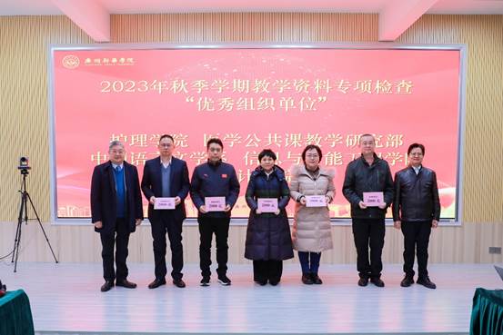 会上,学校对在2023年秋季学期教学资料专项检查中,认真完成工作任务的“优秀组织单位”进行表彰。学校副校长马龙海宣读表彰决定,学校校长王庭槐、党委书记郝登峰为“优秀组织单位”颁发奖金。
