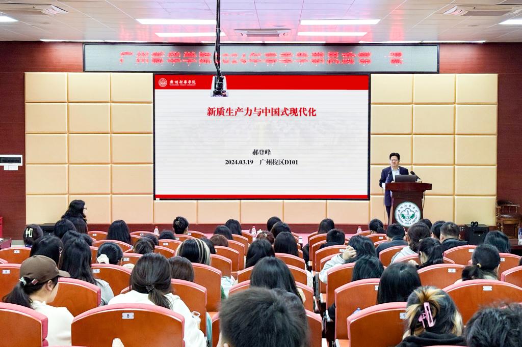3月19日上午,广州新华学院(以下简称“学校”)党委书记郝登峰以“新质生产力与中国式现代化”为题,为学校党校教师,党委工作系统党支部,护理学院、生物医学工程学院师生共160余人讲授新学期“思政第一课”。