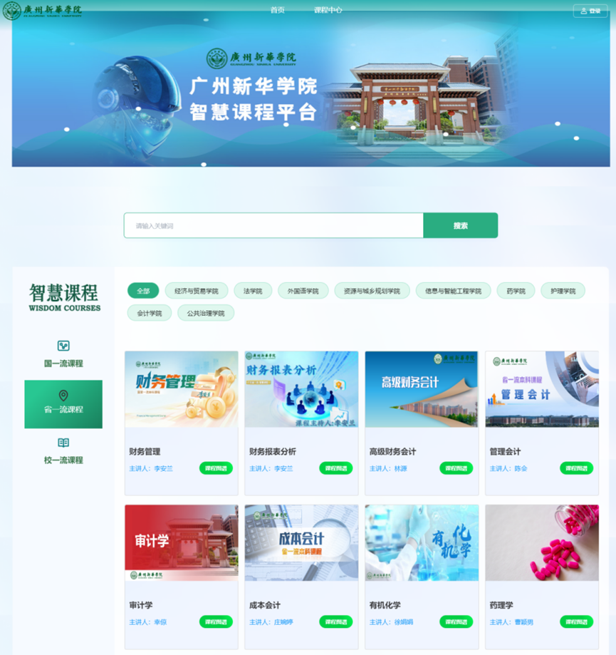 为实现优质课程资源的集中呈现与高效衔接,学校同步建设广州新华学院智慧课程展示平台,作为三级课程体系的“成果窗口”与“一站式学习入口”,筑牢高水平课程培育的“制度+平台”双重根基。