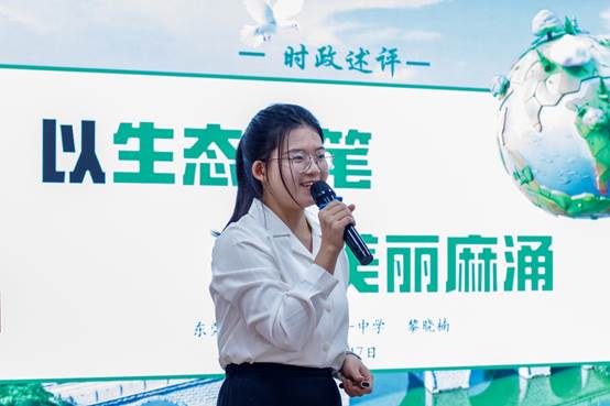 古梅第一中学黎晓楠老师以“以生态之笔 绘美丽麻涌”为题,对“绿水青山就是金山银山”理念展开时政述评,带领学生重温理论,关注现实生态议题,深刻理解青少年守护绿水青山的时代使命。