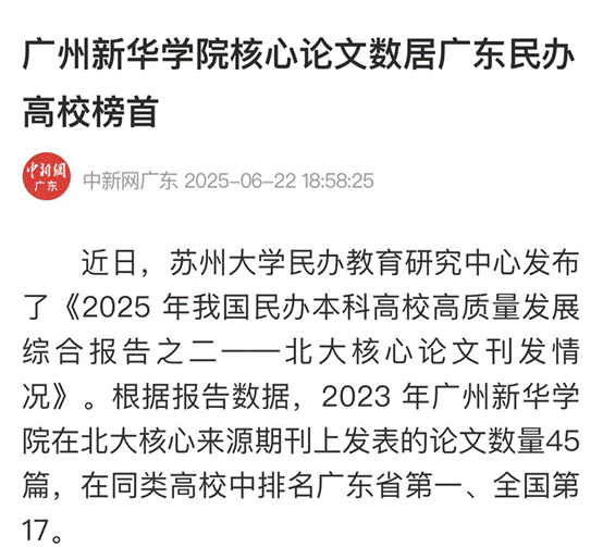 2025年6月,《中国新闻网》《中国高校之窗》《中国教育在线》《羊城晚报》等媒体报道学校在学术成果方面的亮眼成绩。苏州大学民办教育研究中心发布的《2025年我国民办本科高校高质量发展综合报告之二——北大核心论文刊发情况》显示,2023年广州新华学院在北大核心来源期刊上发表论文45篇,在同类高校中位居广东省第一、全国第17。这一数据充分展现了学校在学术研究上的强劲实力与积极进取的态度,也反映出学校在推动高质量发展、提升学术影响力方面取得了显著成效。